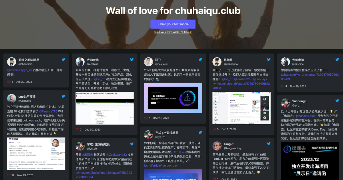 自2023年10月正式上线以来,出海去社区(chuhaiqu.club)在推特平台上聚齐了一批优秀的出海创业者,他们也对社区给予了高度的评价。在未来我们将一同构建独立产品出海的生态,一起出海去!